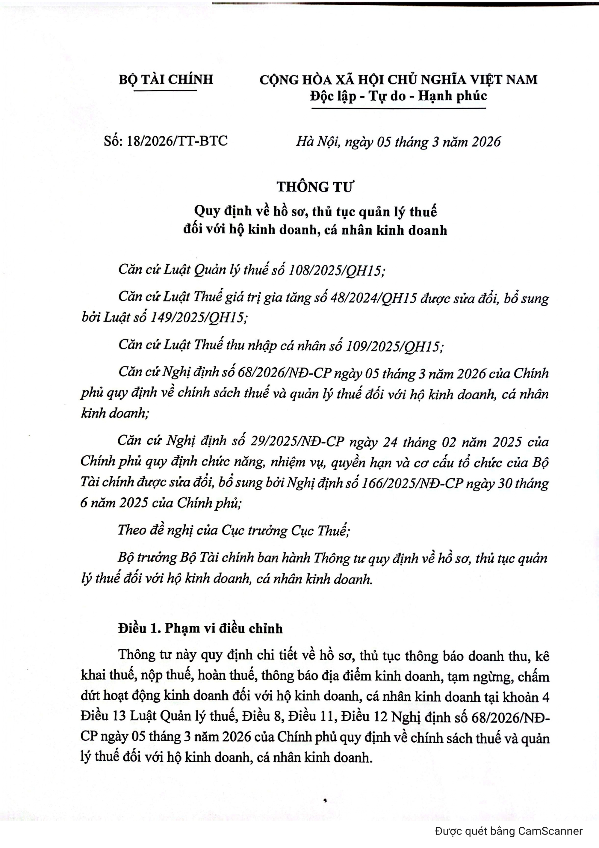 Ngày 5/3/2026, Bộ Tài chính ban hành (Thông tư 18) hướng dẫn chi tiết về hồ sơ, thủ tục thông báo doanh thu, kê khai thuế, nộp thuế, hoàn thuế, thông báo địa điểm kinh doanh, tạm ngừng, chấm dứt hoạt động kinh doanh đối với hộ kinh doanh, cá nhân kinh doanh quy định tại khoản 4 Điều 13 Luật Quản lý thuế số 108/2025/QH15, Điều 8, Điều 11, Điều 12 Nghị định số 68/2026/NĐ-CP (Nghị định 68) của Chính phủ quy định về chính sách thuế và quản lý thuế đối với hộ kinh doanh, cá nhân kinh doanh.