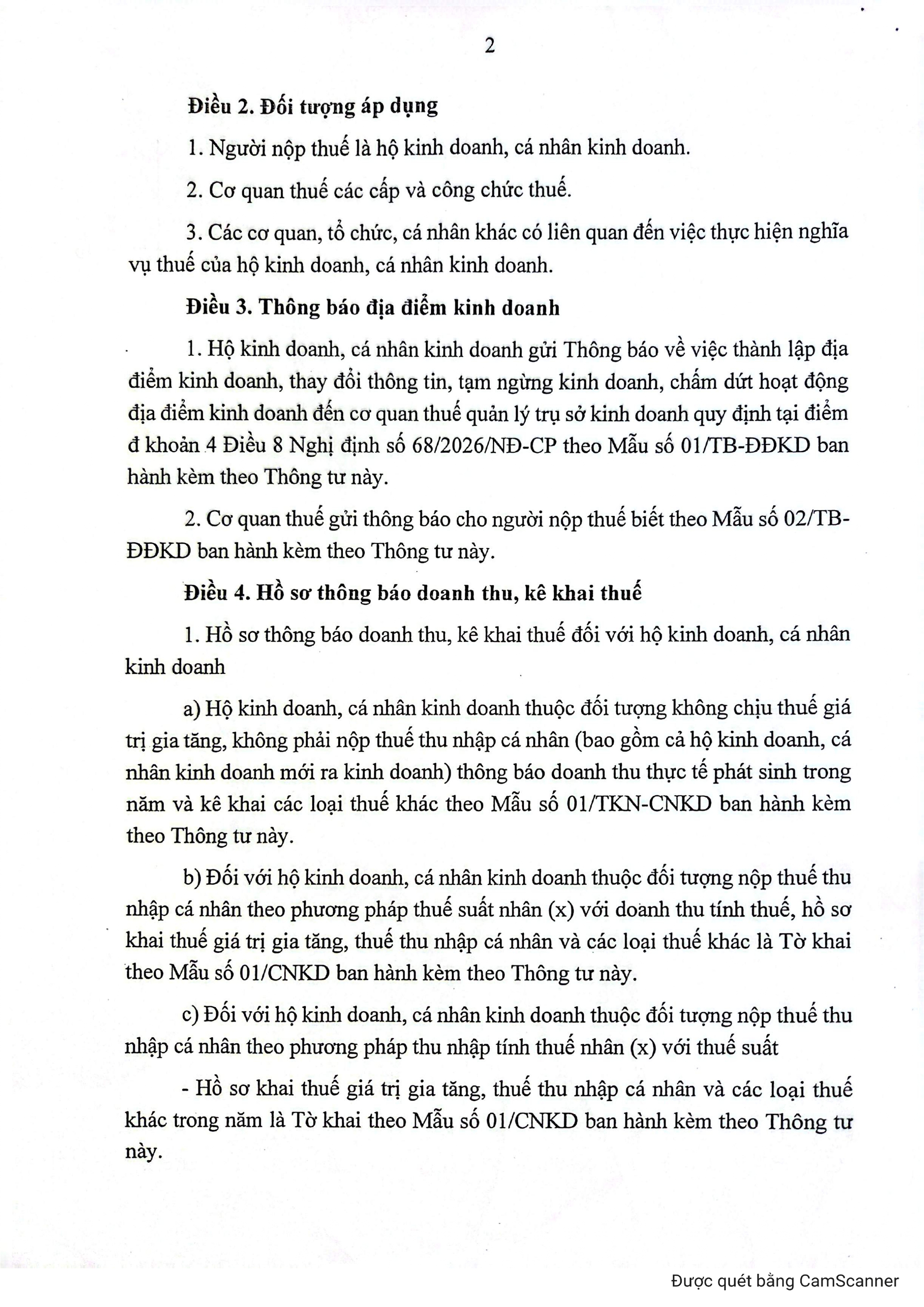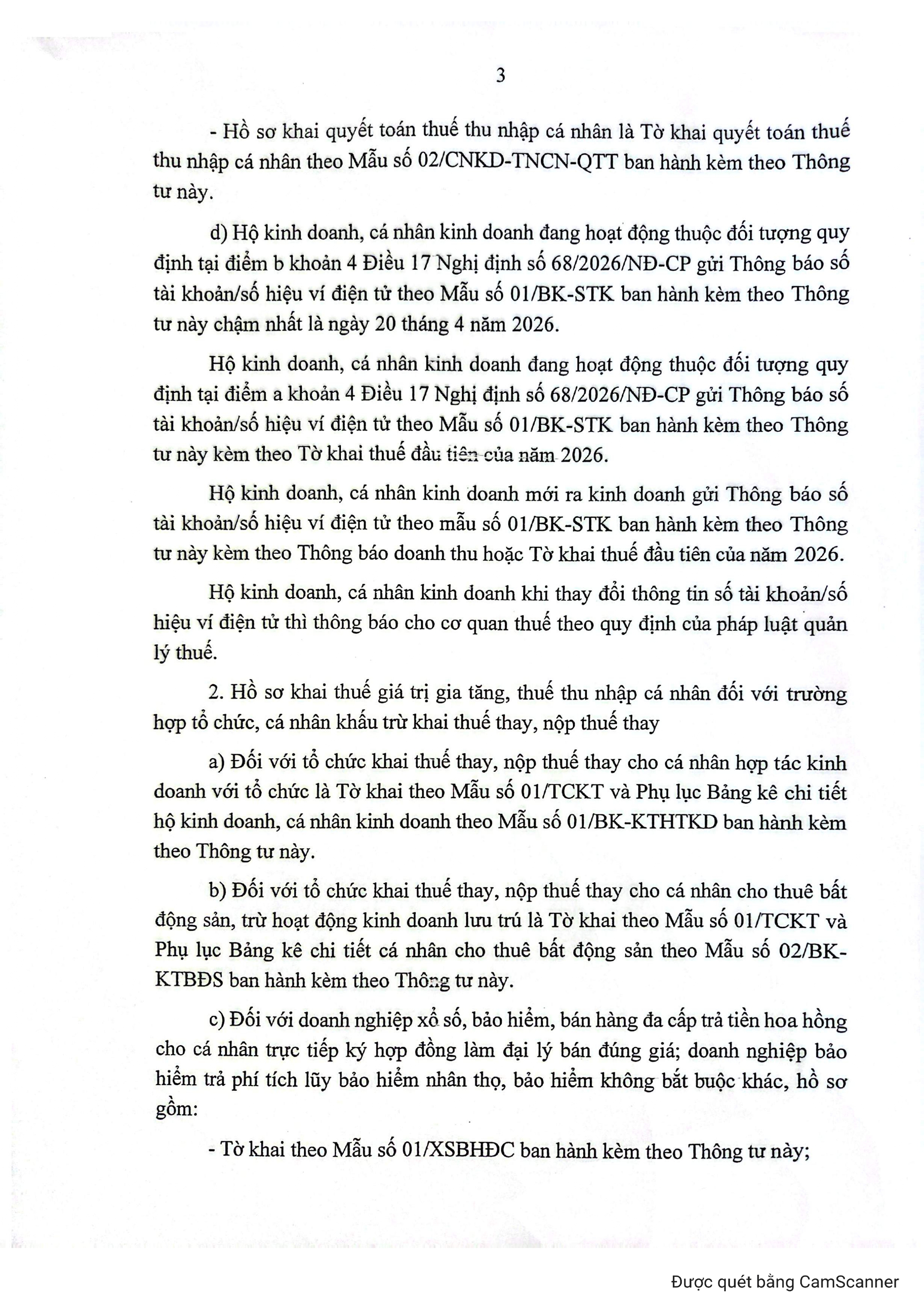 Hộ kinh doanh, cá nhân kinh doanh đang hoạt động thuộc đối tượng quy định tại điểm b khoản 4 Điều 17 Nghị định 68 gửi thông báo số tài khoản/số hiệu ví điện tử theo Mẫu số 01/BK-STK ban hành kèm theo thông tư này chậm nhất là ngày 20/4/2026.